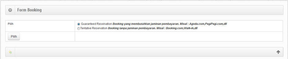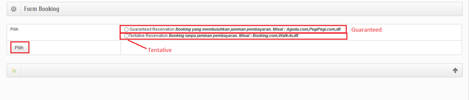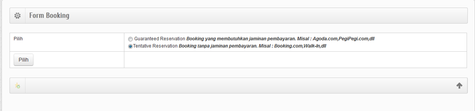 Booking disini adalah pemesanan kamar oleh tamu yang disertai dengan jaminan pembayaran. Misalnya : Ada Tamu dari Agoda, dimana tamu tersebut sudah membayar ke pihak Agoda, atau tamu travel yang booking disertai dengan down payment. Pertama yang harus dilakukan adalah memilih Guaranteed Reservation seperti gambar dibawah ini.