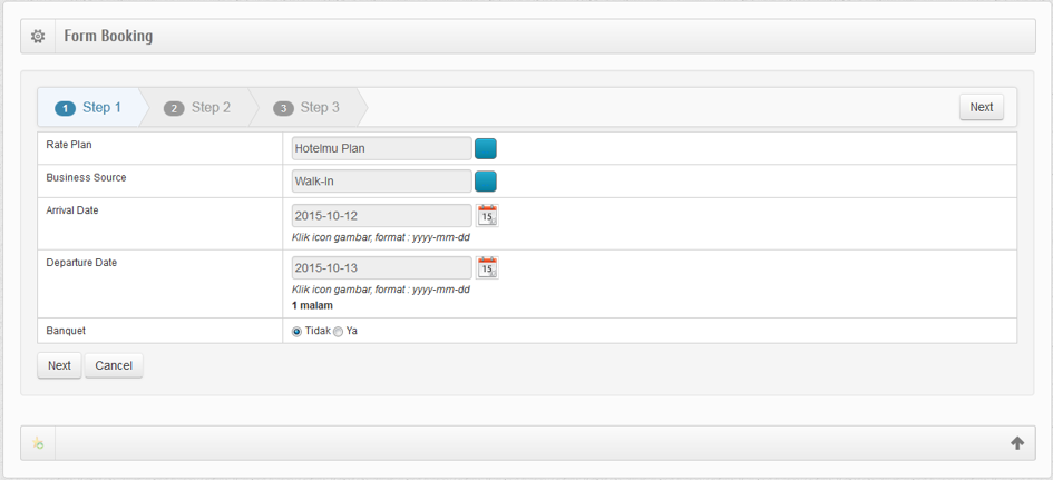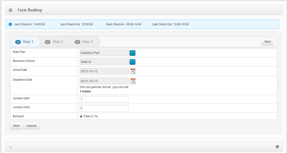 Selanjutnya, setelah memilih jenis reservation, pada tahap pertama booking ini sama halnya dengan langkah pertama Checkin. Dimana, pada tahap ini Front Office akan mengisi data diantaranya Rate Plan, Business Partner, Arrival Date, Departure Date, Jumlah Adul, Jumlah Child, dan Banquet. Berikut ini gambar halaman tahap pertama Guaranteed Reservation.