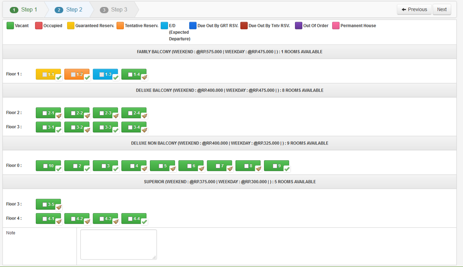 Pada tahap ke-2, Front Office harus memilih kamar yang akan dibooking oleh tamu. Pada gambar diatas terlihat ada dua kamar yang sudah dibooking, yaitu booking Guaranteed (Kuning), dan Booking Tentative (Orange). Dan kamar yang sudah dibooking tidak dapat dipilih/dibooking kembali pada tanggal yang sama. Silahkan ceklist/pilih pada kamar yang berstatus Vacant (berwarna hijau) sesuai dengan pilihan tamu. Setelah memilih kamar, silahkan klik button Next untuk melanjutkan ke tahap berikutnya. Kemudian, pada tahap yang terakhir, dimana pada form ini terdapat room rates dan data tamu yang akan booking. Dikarenakan ini adalah Booking Guaranteed/booking yang membutuhkan jaminan, maka booking harus disertai dengan down payment.