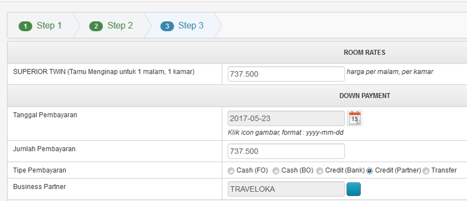 Pertanyaannya, bagaimana jika ada bookingan dari OTA Traveloka. Dimana, pembayaran dari Traveloka tidak menentu. Misalkan harga kamar normal yang sudah disetting di aplikasi adalah Rp. 865.000, dan Traveloka transfer/bayar Rp. 737.500. Maka Front Office harus mengubah harga per-malam pada step-3 ini sesuai dengan yang ditransfer oleh Traveloka.