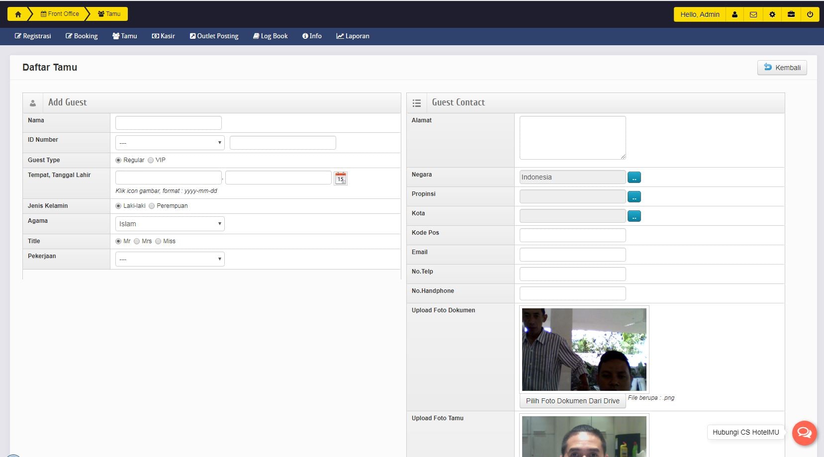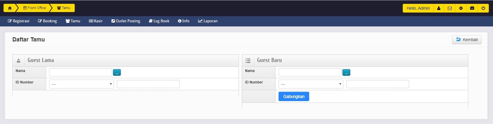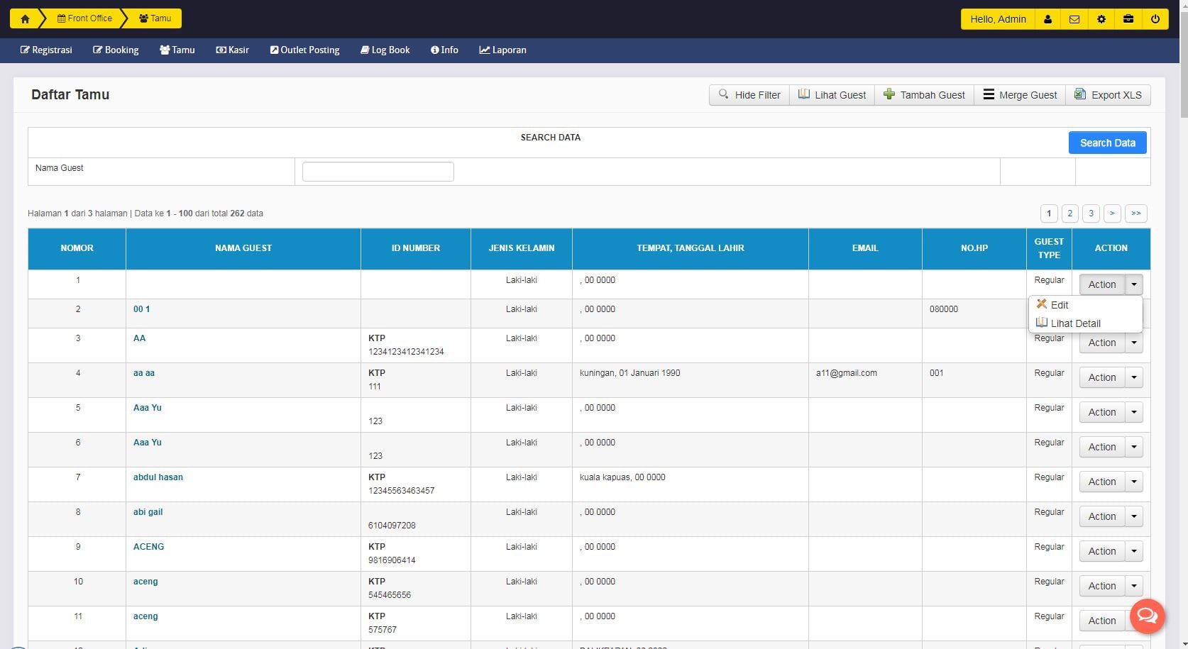 Gambar diatas merupakan Daftar Tamu. Terdapat beberapa menu, diantaranya Show Filter, Lihat Guest, Tambah Guest, dan Merge Guest. Untuk Edit data dan Hapus Data, silahkan klik pada Menu Action, maka akan tampil dropdown menu Edit dan Hapus.