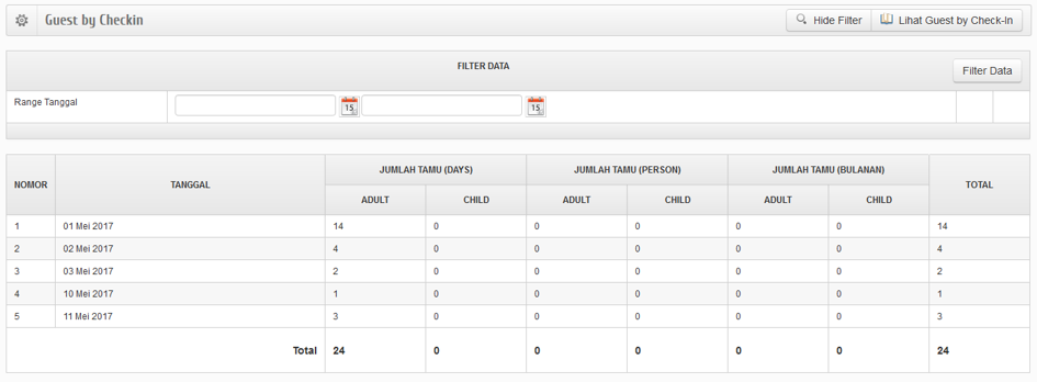 Guest by Checkin merupakan halaman yang berisi laporan jumlah tamu perbulan berdasarkan Room Plan Harian, Person, dan Bulanan (tamu tersebut sudah Checkout). Misal : Ada Tamu Checkin dengan Plan harian bernama Nurul Hilda pada tgl 12 September 2017 – 13 September 2017. Nah, data tersebut masuk ke laporan Guest by Checkin tanggal 12 September 2017 apabila tamu tersebut sudah checkout.