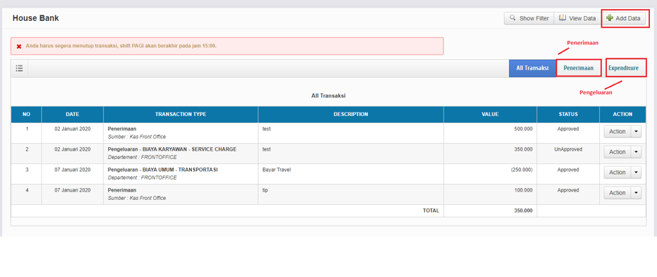 Fitur ini digunakan untuk mencatat setiap penerimaan patty cash dan pengeluaran biaya dari Front Office.
