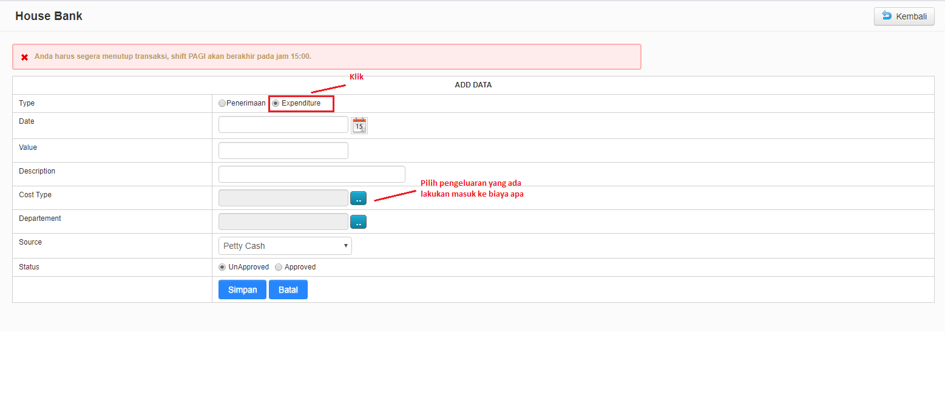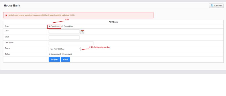 - Setelah itu akan muncul form yang harus di isi, pada bagian tipe pilih tipe penerimaan. Kemudian tinggal isi kolom-kolom dibawahnya sesuai keterangannya masing-masing. Pada bagian source FO di wajibkan memilih, apakah sumber penerimaan ini dari kas Front Office sendiri, atau dari back office. Setelah itu ada pilihan, apakah status penerimaan yang anda input ini approve atau unapproved. Perlu diingat jika status nya sudah approve, maka data tak bisa di ubat dan di hapus. Maka kami sarankan jika data belum valid, status bisa di unapprovekan terlebih dahulu. Kalau sudah klik simpan.