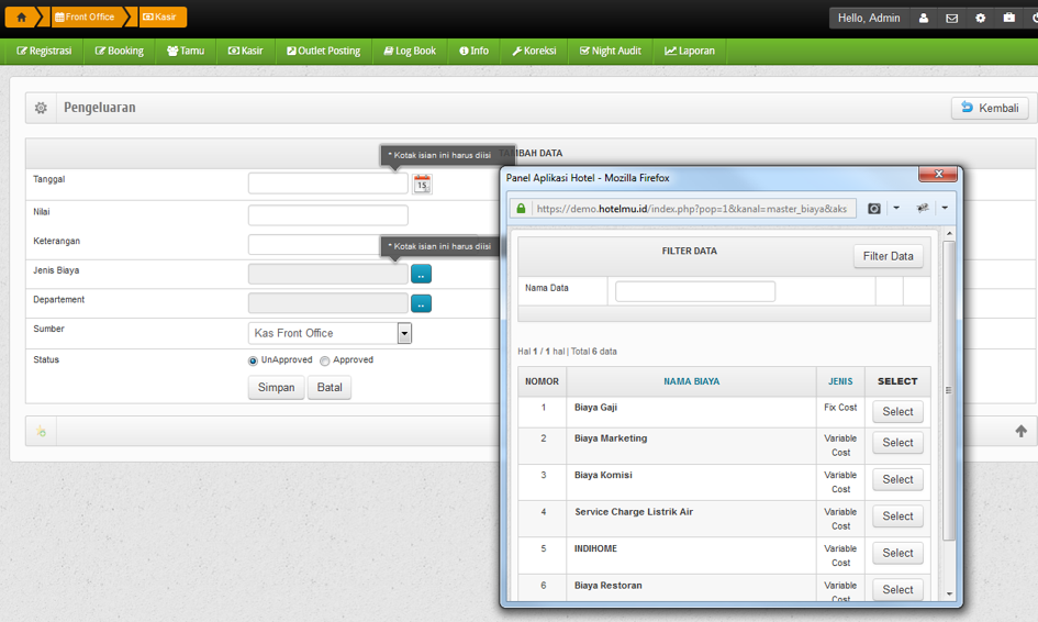 Halaman ini merupakan halaman untuk mengatur biaya/pengeluaran Hotel. Untuk menambahkan data pengeluaran, silahkan klik button Tambah Data. Berikut ini halaman Tambah data Pengeluaran.