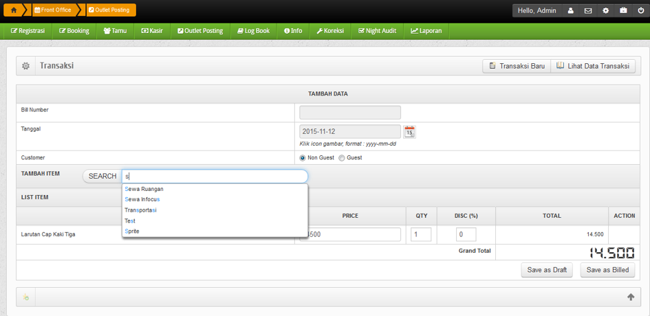 Silahkan Search Tambah Item. Kemudian pada List Item, silahkan isi Quantity dan Diskon (jika ada diskon). Jika belum melakukan pembayaran, silahkan klik button Save as Draft. Dan jika mau melanjutkan ke pembayaran, silahkan klik button Save as Bill.