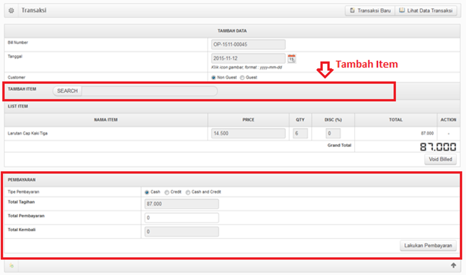 Silahkan isi form pemabayaran, diantaranya Tipe Pembayaran, dan Total Pembayaran. Pada saat pembayaran, ada tiga tipe pembayaran yaitu Cash, Credit, dan Cash and Credit.