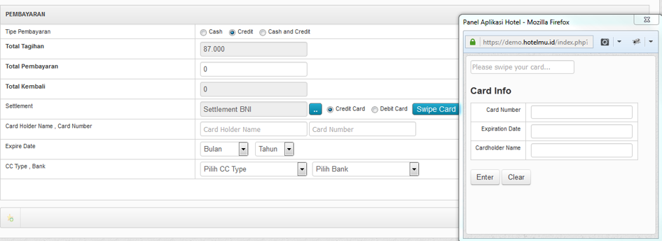 Pilih Bank Settlement dengan mengklik kotak kecil berwarna biru (Credit Card/Debit card). Kemudian, silahkan isi Card Holder Name & Card Number. Untuk mengisi card Holder Name & Card Number, dan Expire Date bisa juga dengan Swipe Card (Gesek Kartu pada EDC). Setelah itu, isi CC Type dan Bank, dan klik button Lakukan Pembayaran.