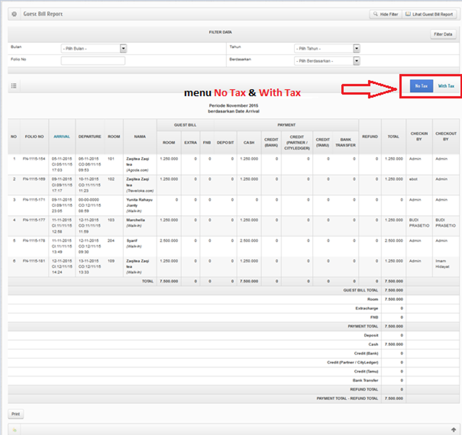 Guest Bill Report Guest Bill Report Merupakan halaman yang berisi data–data tagihan tamu perbulan yang sudah checkout (No In House). Pada halaman ini, ditampilkan laporan tagihan tamu tanpa pajak dan juga tagihan tamu dengan pajak. Apakah artikel ini membantu? Ya : 732 | Tidak : 857