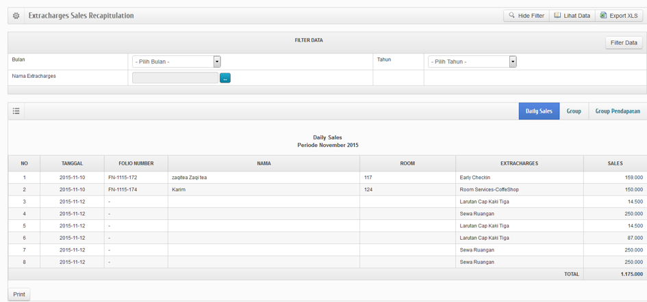 pendapatan extracharge dari tiap transaksi yang terjadi di Folio number kamar, keterangan tersebut dilengkapi dari mana asal pendapatan tersebut, untuk lebih jelasnya silahkan lihat gambar dibawah ini.