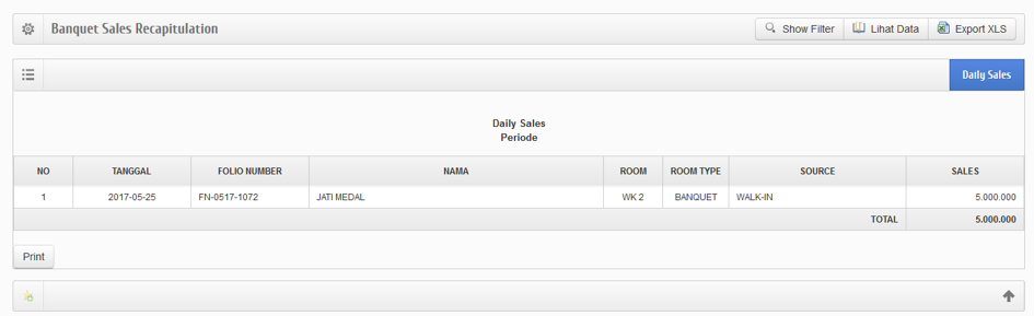 Halaman ini berisi laporan penjualan khusus banquet baik yang In House atatupun sudah checkout. Berikut ini gambar halaman Banquet Sales Recapitulation.