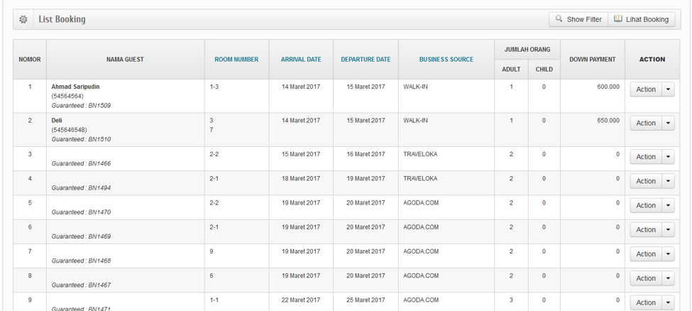 Modul ini menampilkan list booking supaya House Keeping tahu daftar kamar yang telah dibooking baik guaranteed(disertai jaminan) ataupun tentative (tanpa jaminan). Berikut ini kami tampilkan contoh format List Booking.