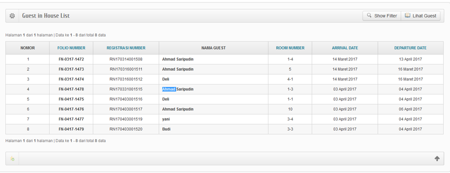 Guest in House List Guest in House List Modul ini menampilkan data-data tamu yang sedang menginap supaya House Keeping tahu daftar kamar yang sedang ada hunian-nya. Berikut ini kami tampilkan contoh format daftar tamu menginap. Apakah artikel ini membantu? Ya : 1056 | Tidak : 984