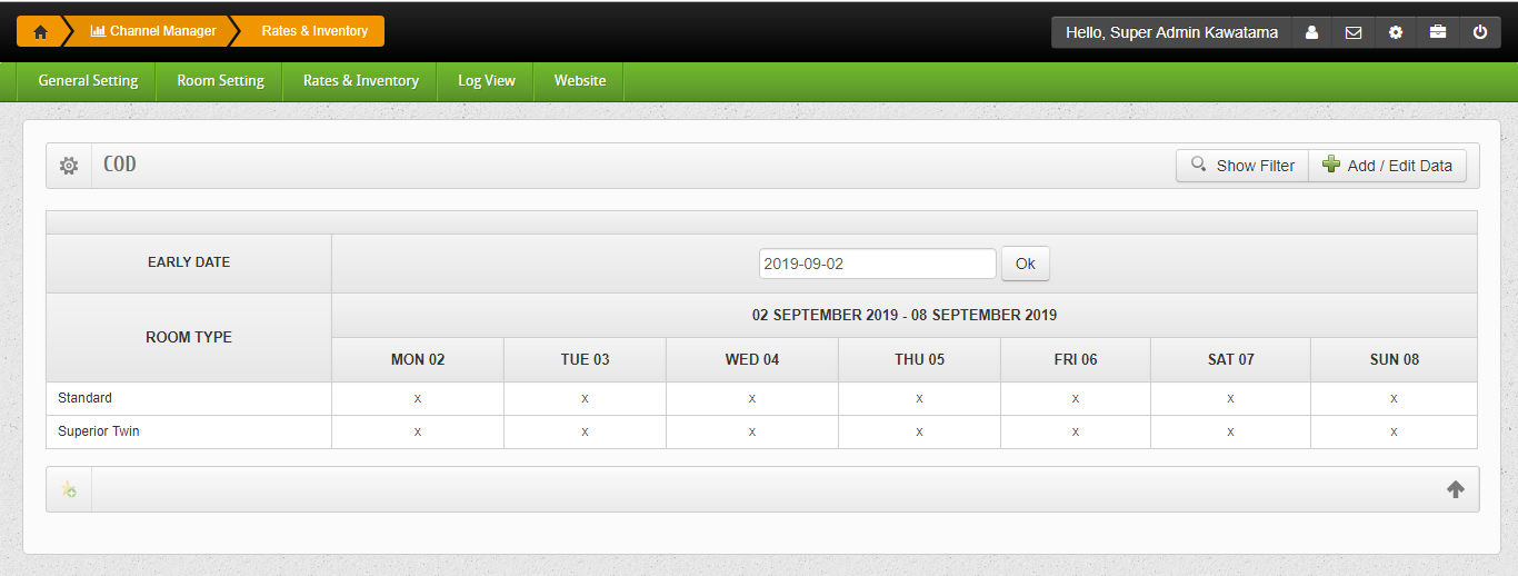contoh nya ketika ada tamu yang melakukan reservasi pada tanggal 1 januari 2019 sampai tanggal 3 januari 2019, sedangkan pada tanggal 3 januari tersebut pihak hotel sudah melakukan set COD di jauh jauh hari, maka tamu tersebut tidak bisa melakukan reservasi sampai tanggal 3 januari akan tetapi jika melebihi tanggal tersebut, seperti tanggal 4 dan seterusnya itu bisa. Karena tanggal yang sudah di set sebagai COD sudah terlewat. Untuk menambahkan/menset COD, dapat di lakukan dengan cara klik tombol Add atau edit data.