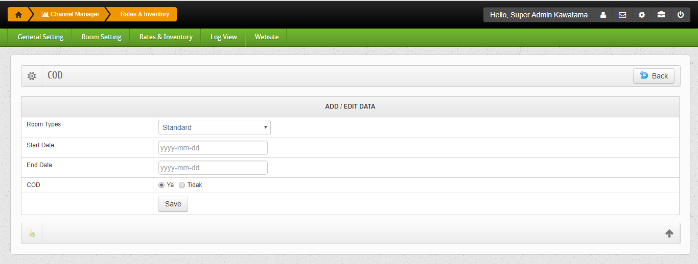 Berikut halaman untuk menset COD,di mulai dari memilih type room,input priode start date dan end date ,kemudian dilanjut dengan mengklik check “ya” pada pilihan COD,dan klik save untuk menyimpan dan menset COD tersebut.