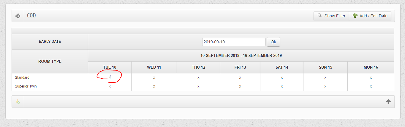 Berikut contoh COD yang sudah di set,pada halaman ini admin menset COD pada tanggal 10 September 2019, sehinga tamu tidak bisa booking kamar untuk checkout pada tanggal tersebut.